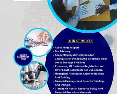 We provide other services including Accounting Support Services, Designed and setup of Accounting Systems, Capacity Training, Building, Crafting of Human Resource Policy and Financial procedural Manuals. We also Process Business Registration and other legal document for our clients.