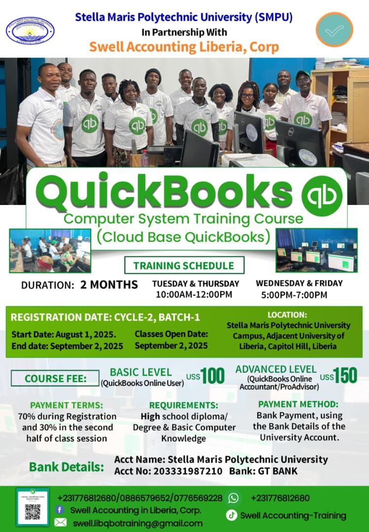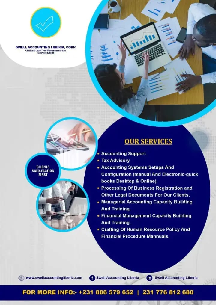 Swell Accounting Liberia, Corp was registered in 2016. The company is established to provide accounting and tax consultancy services to companies, civil society organizations and individual, particularly in the Micro, Small and Medium Enterprises (MSME/SMEs) within the provide sector and undertakes contracts both in urban and rural Liberia and is committed to understanding the growing needs in terms of quality and ethic required by our clients with a view of meeting these needs to their utmost satisfaction. Our clients’ demand is our motivating factor.